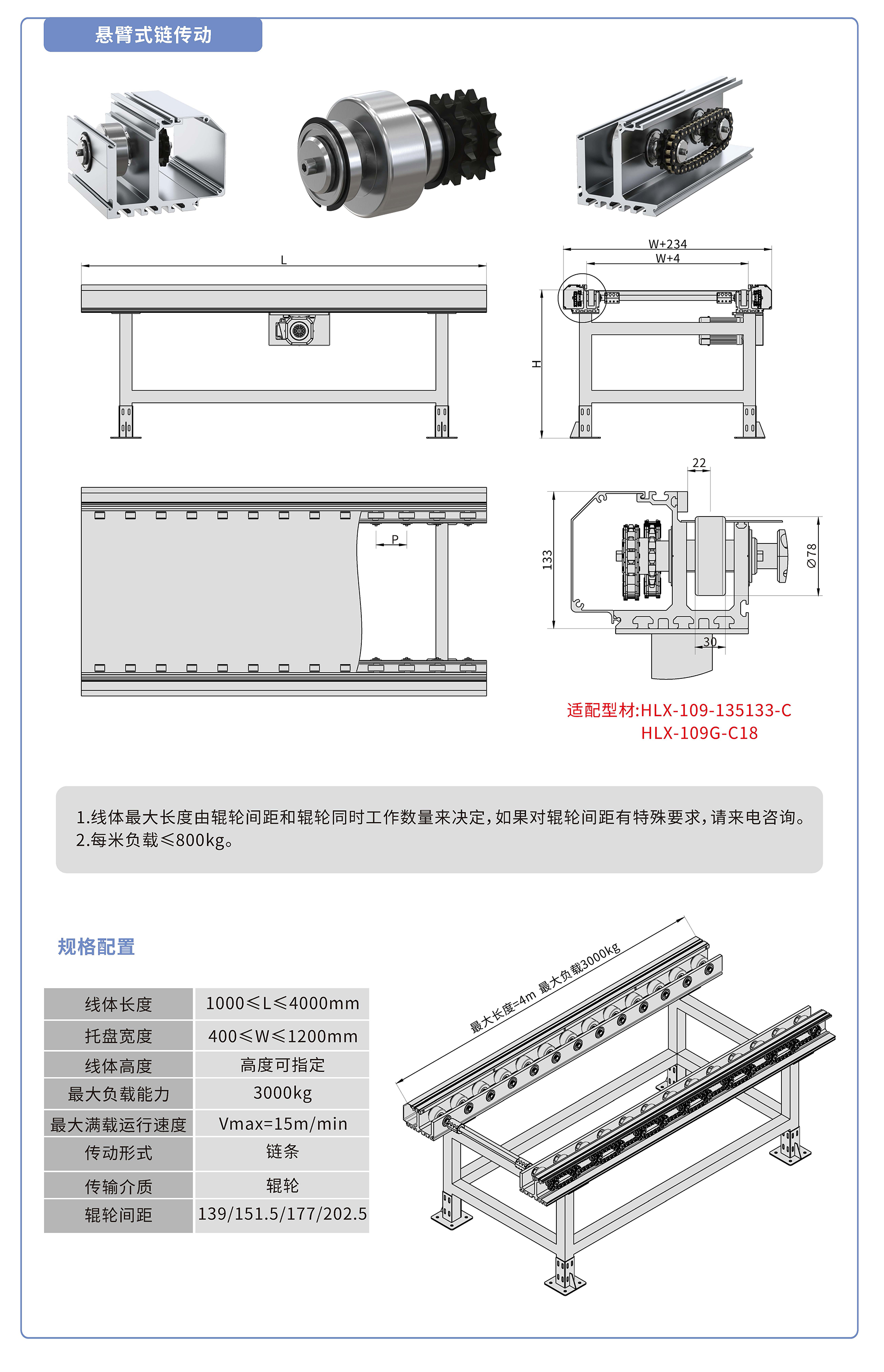采用135133鋁型材,鏈輪傳動,鍍鉻滾輪鑲嵌銅套實現(xiàn)積放功能,負(fù)載3000kg/米,最大負(fù)載速度15M/min, 輪距139、151.5、177、202.5可選,適用托盤寬度400-1200mm,線體長度范圍1000-4000mm, 高度根據(jù)需求定制.
