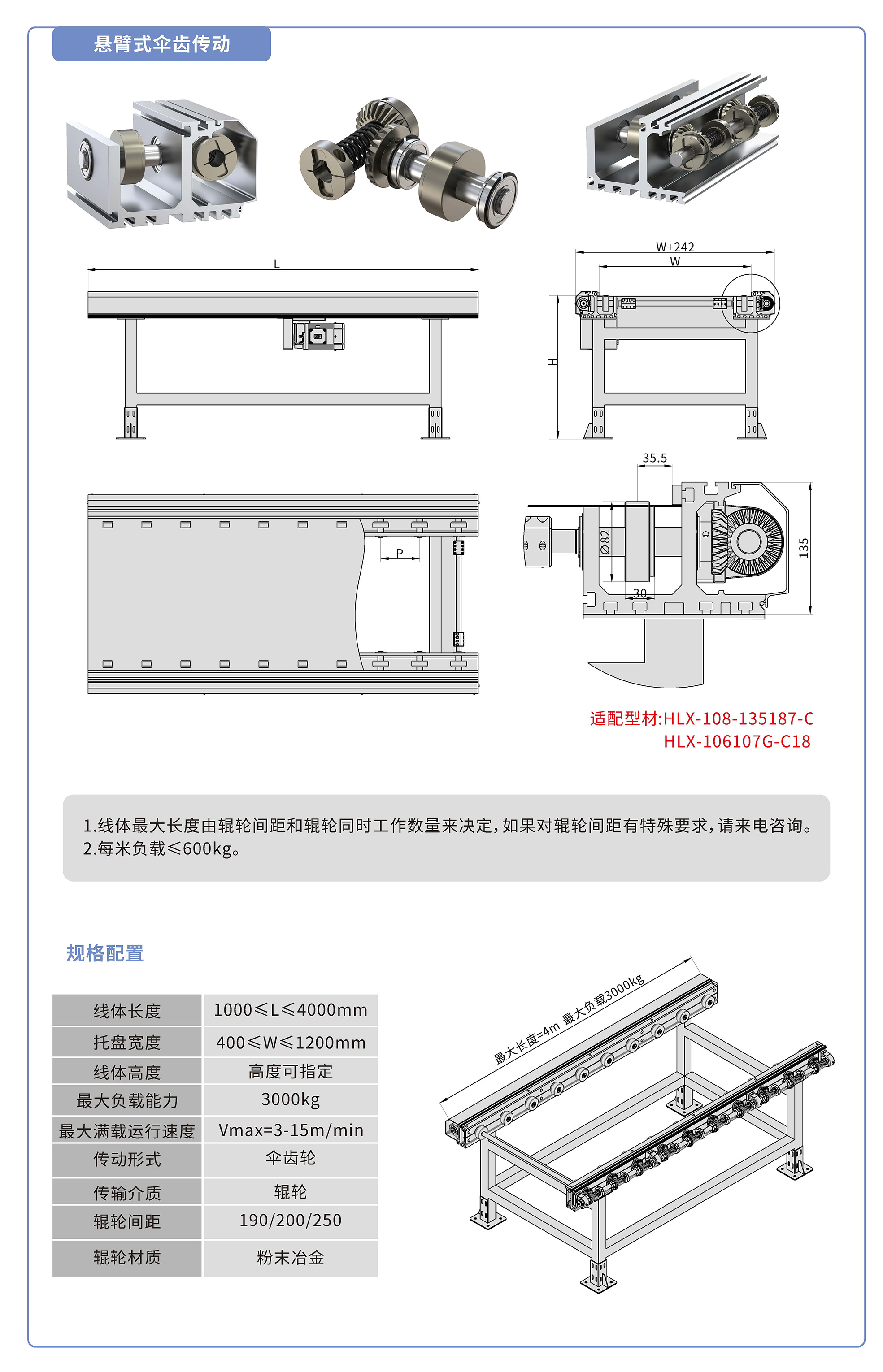 采用135187鋁型材,傘齒驅(qū)動(dòng),粉末冶金滾輪鑲嵌銅套實(shí)現(xiàn)積放功能,負(fù)載3000kg/米,最大負(fù)載速度15M/min, 輪距190、200、250可選,適用托盤寬度400-1200mm,線體長(zhǎng)度范圍1000-4000mm, 高度根據(jù)需求定制.