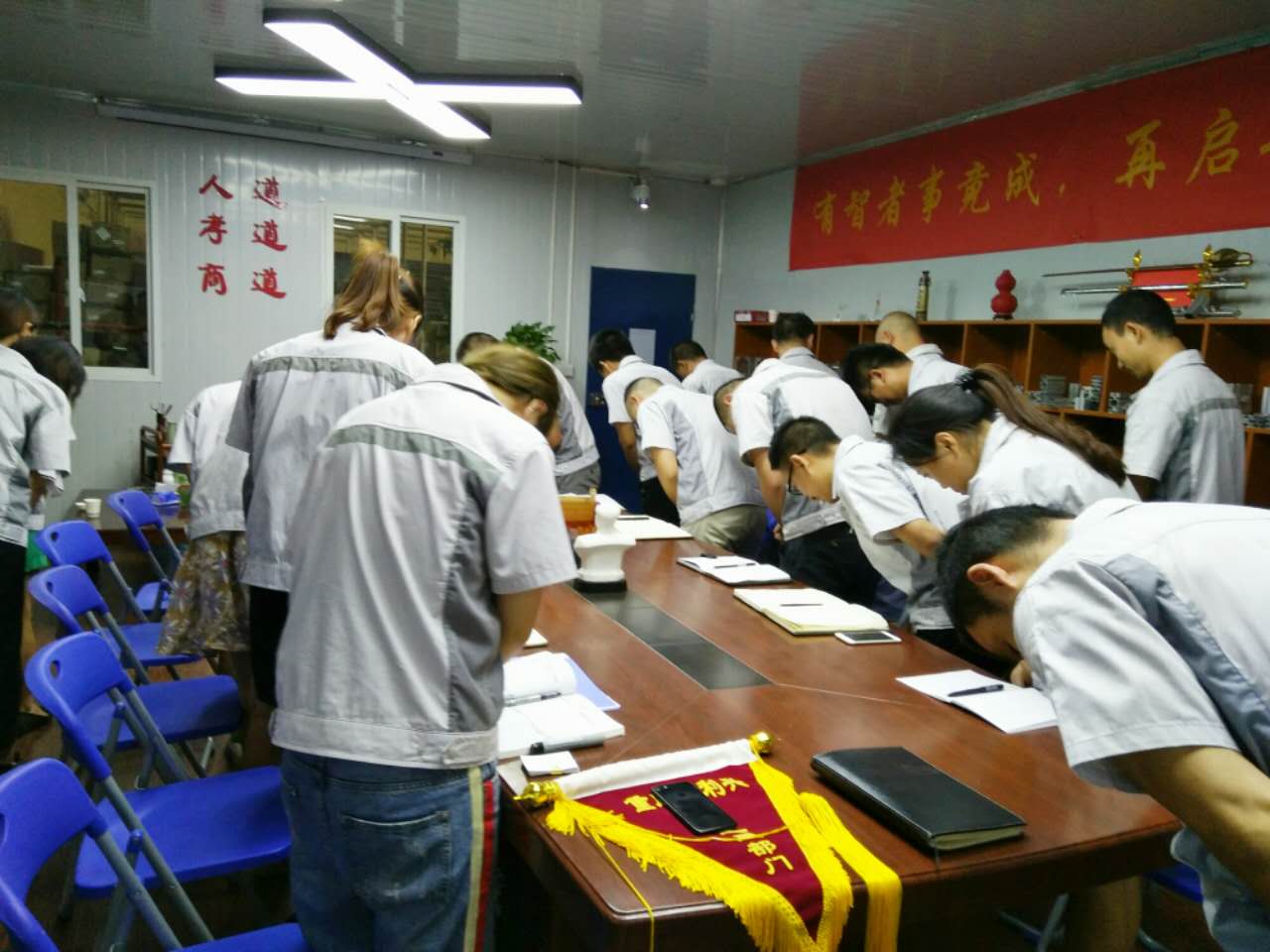 2017年8月1日晚,我司全體人員在匯興學校召開七月月度大會,依次由自我價值稱估稱及簽到入場。大會召開前,全體人員對企業(yè)三道(人道、孝道、商道)行三鞠躬,隨后進入會議主題。