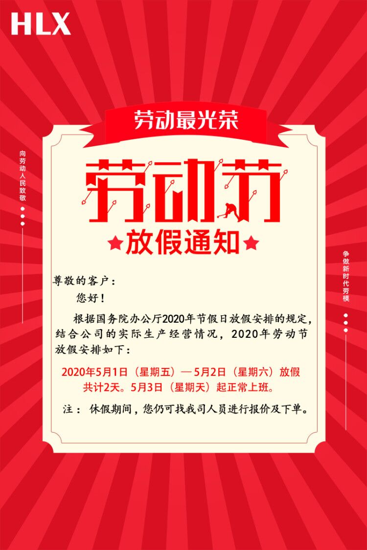 尊敬的客戶: 您好! 根據(jù)國(guó)務(wù)院辦公廳2020年節(jié)假日放假安排的規(guī)定,結(jié)合公司的實(shí)際生產(chǎn)經(jīng)營(yíng)情況,2020年勞動(dòng)節(jié)放假安排如下: 2020年5月1日(星期五)— 5月2日(星期六)放假,共計(jì)2天。5月3日(星期天)起正常上班。 放假期間,為避免發(fā)貨延遲請(qǐng)?zhí)崆白龊糜唵伟才?。由此給您帶來的不便,敬請(qǐng)諒解!
