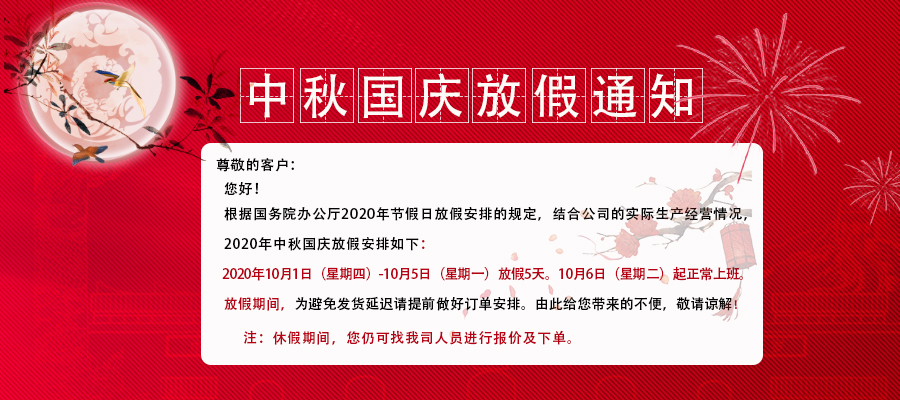 尊敬的客戶: 您好! 根據(jù)國(guó)務(wù)院辦公廳2020年節(jié)假日放假安排的規(guī)定,結(jié)合公司的實(shí)際生產(chǎn)經(jīng)營(yíng)情況,2020年中秋國(guó)慶放假安排如下: 2020年10月1日(星期四)-10月5日(星期一)放假5天。10月6日(星期二)起正常上班。 放假期間,為避免發(fā)貨延遲請(qǐng)?zhí)崆白龊糜唵伟才?。由此給您帶來(lái)的不便,敬請(qǐng)諒解!