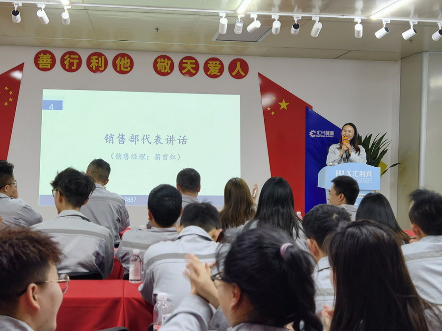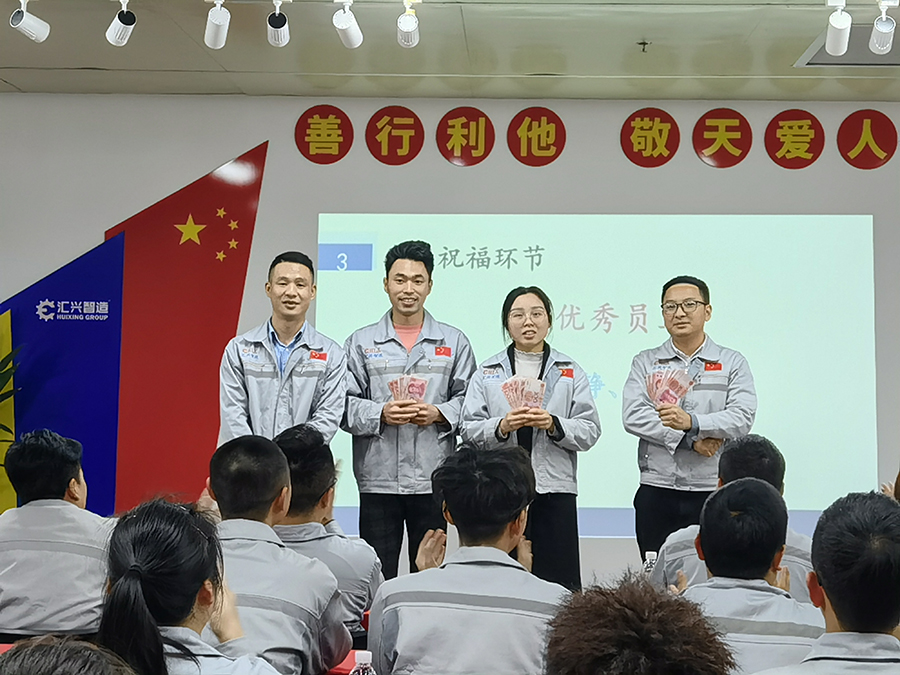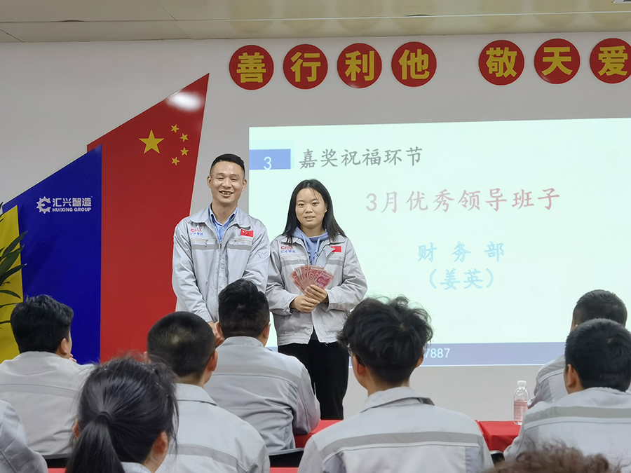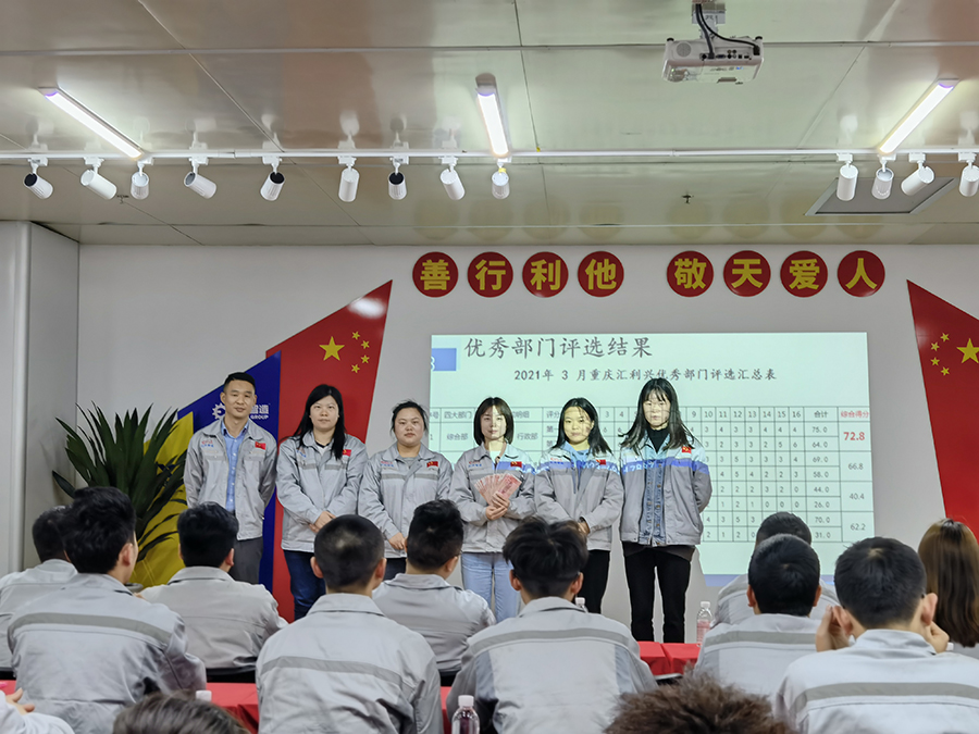 業(yè)精于勤,荒于嬉,行成于思,毀于隨??偨Y(jié)上個月工作情況,統(tǒng)籌下一個月工作計劃。匯利興西南工廠于4月9日18點40分,在匯利興學(xué)校召開三月月度會議。銷售主管劉文主持,匯利興西南工廠全體職員參會。會議開始,兩位高管敲響士氣鼓,敲響我們出征的號角,前進(jìn)的戰(zhàn)鼓,鼓舞著每位員工沖鋒打勝仗的決心和毅力。全體員工向企業(yè)三道孝道、商道、人道鄭重鞠躬,宣讀企業(yè)文化,并對本月新入員工進(jìn)行歡迎儀式。 春天是播種的季節(jié),同時也是催人奮進(jìn)的季節(jié)。為了表彰在三月份表現(xiàn)突出的優(yōu)秀個人、優(yōu)秀主管、優(yōu)秀部門,充分發(fā)揮引領(lǐng)示范作用,最大限度調(diào)動和激發(fā)員工向優(yōu)秀人員看齊、不斷提高工作的積極性和創(chuàng)造性。本次榮獲優(yōu)秀員工(曾濤、邵靜、鄧筵暉)、優(yōu)秀主管(姜英)、優(yōu)秀部門(綜合部)。自成立以來,公司大力宣導(dǎo)我來干、努力干、拼命干的工作作風(fēng),積極鼓勵無私奉獻(xiàn)、恪盡職守的三好匯興人,并堅持打造一支有愛、有力量、有活力的團(tuán)隊。
