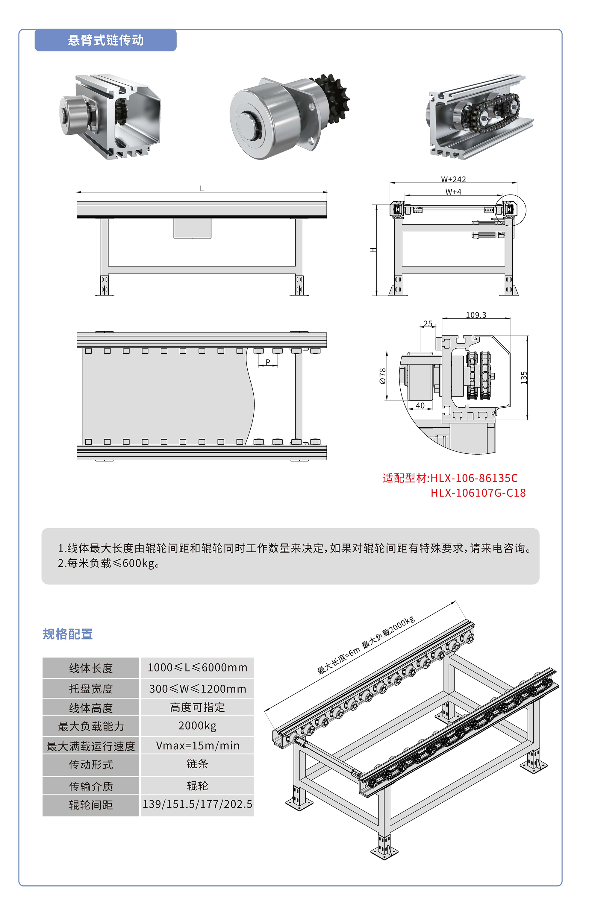 懸臂式鏈傳動:采用86135鋁型材,鏈輪傳動,鍍鉻滾輪鑲嵌銅套實現(xiàn)積放功能,負載2000kg/米,最大負載速度15M/min, 輪距139、151.5、177、202.5可選,適用托盤寬度300-1200mm,線體長度范圍1000-6000mm, 高度根據(jù)需求定制