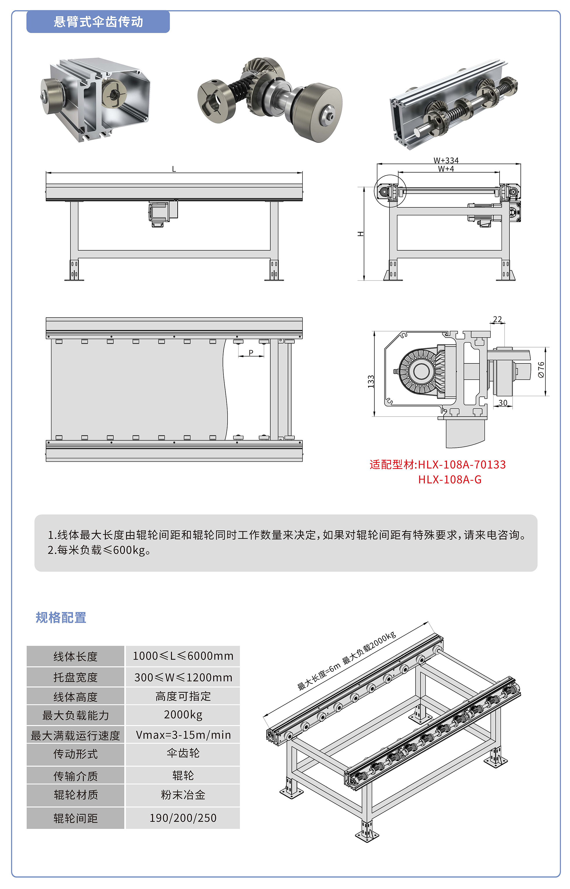 采用70133鋁型材,傘齒驅(qū)動(dòng),粉末冶金滾輪鑲嵌銅套實(shí)現(xiàn)積放功能,負(fù)載2000kg/米,最大負(fù)載速度15M/min, 輪距190、200、250可選,適用托盤寬度300-1200mm,線體長度范圍1000-6000mm, 高度根據(jù)需求定制.