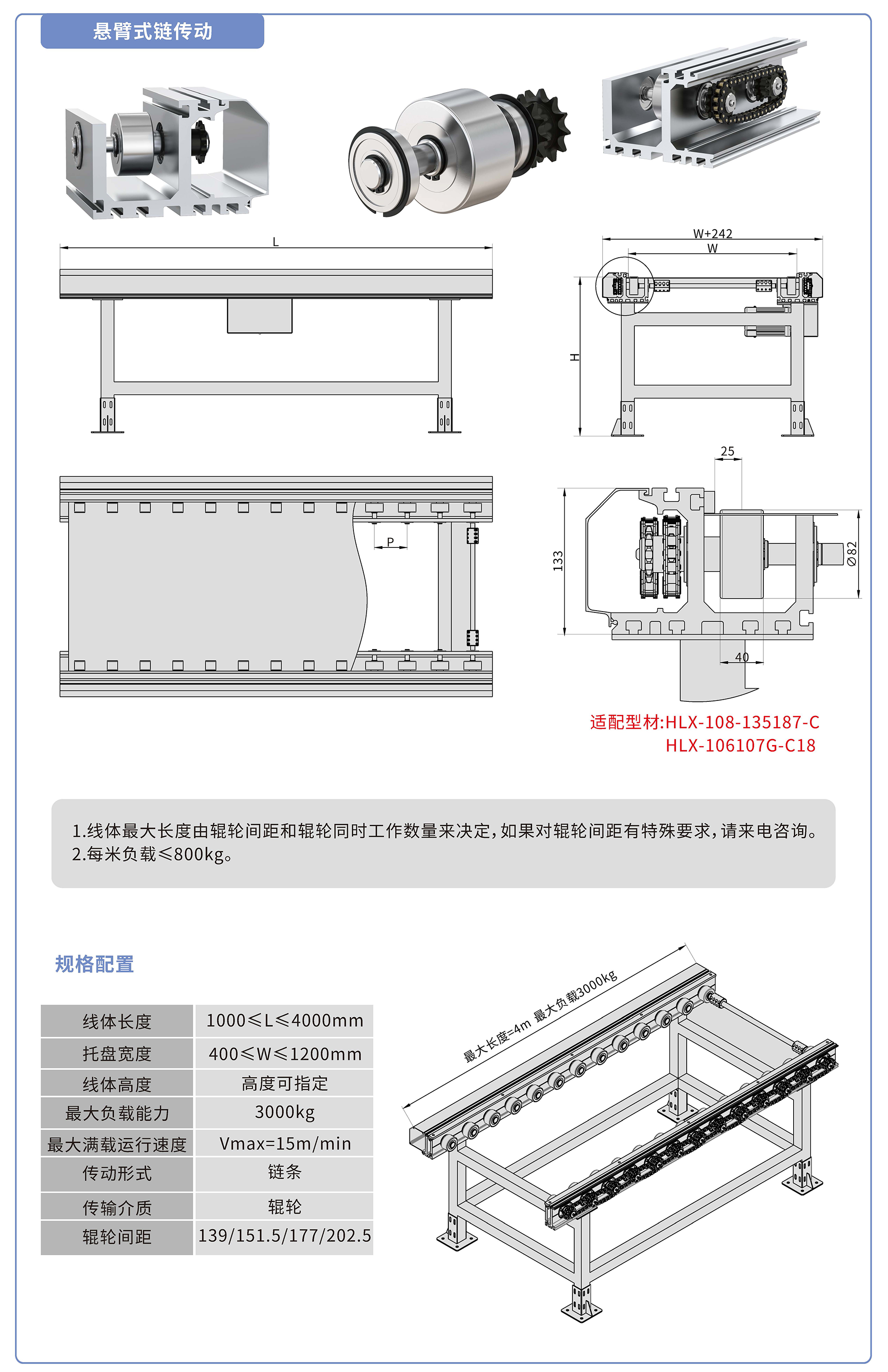 采用135187鋁型材,鏈輪傳動,鍍鉻滾輪鑲嵌銅套實現(xiàn)積放功能,負(fù)載3000kg/米,最大負(fù)載速度15M/min, 輪距139、151.5、177、202.5可選,適用托盤寬度400-1200mm,線體長度范圍1000-4000mm, 高度根據(jù)需求定制.
